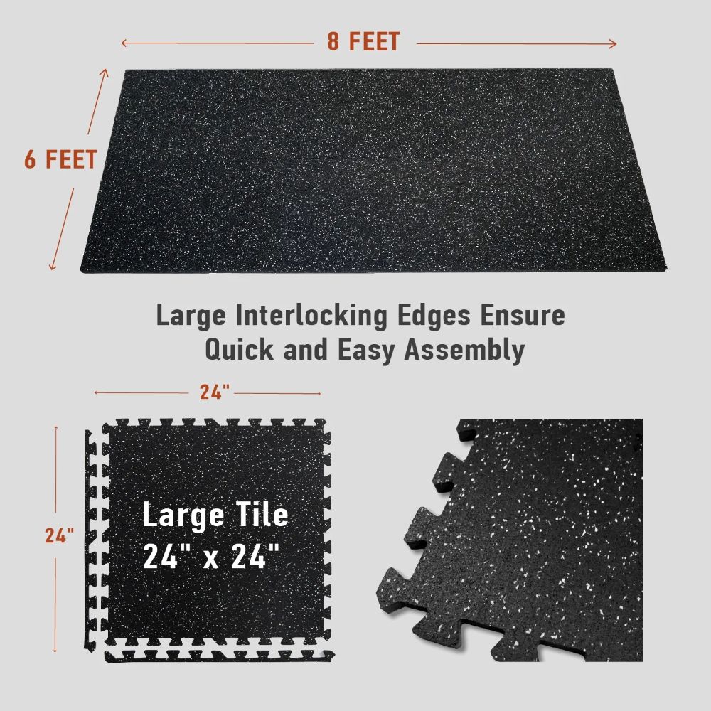 - [Easy to Assemble and Detach]: 12 tiles (24″ x 24″ x 0.56″ each), covers 48 sq ft (8 × 6 ft). Upgraded larger interlocking locks provide a secure fit, preventing any separation during use, ensuring you can work out without concerns of shifting. Simple assembly and detachment make it effortless to set up your home gym.