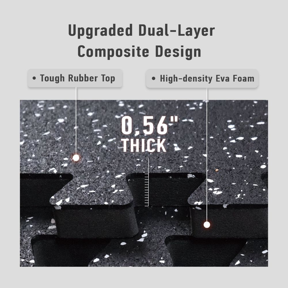 - [Upgraded Dual-Layer Design]: Concerned about your equipment scratching the floor during workouts? Our 2in8 Rubber Top EVA Foam Exercise Gym Mats are crafted to solve this issue. The textured rubber top layer, combined with a high-density EVA foam bottom layer, seamlessly creates a non-slip tough surface with excellent shock absorption.