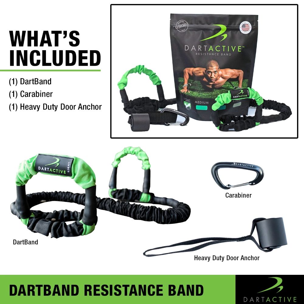 • HOME WORKOUT SOLUTION – The DartBand Accessory Pack includes everything you need to get a complete workout–all without ever leaving your home! The accessory pack comes with (1) DartBand, a carabiner clip, and a heavy-duty door anchor.