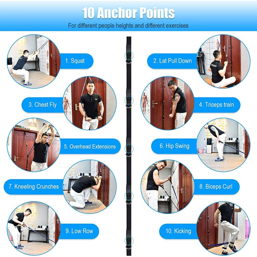 - Multi Anchors Our resistance bands set features 5 position anchors from the strap top to bottom, ensuring that they can meet different exercise modes and accommodate people of all heights. You have the flexibility to choose different heights to complete various actions. The 5 stainless steel D-rings on the door anchors have been specially designed to make connecting the carabiners effortless. This ensures greater convenience and ease of use during your workout sessions.