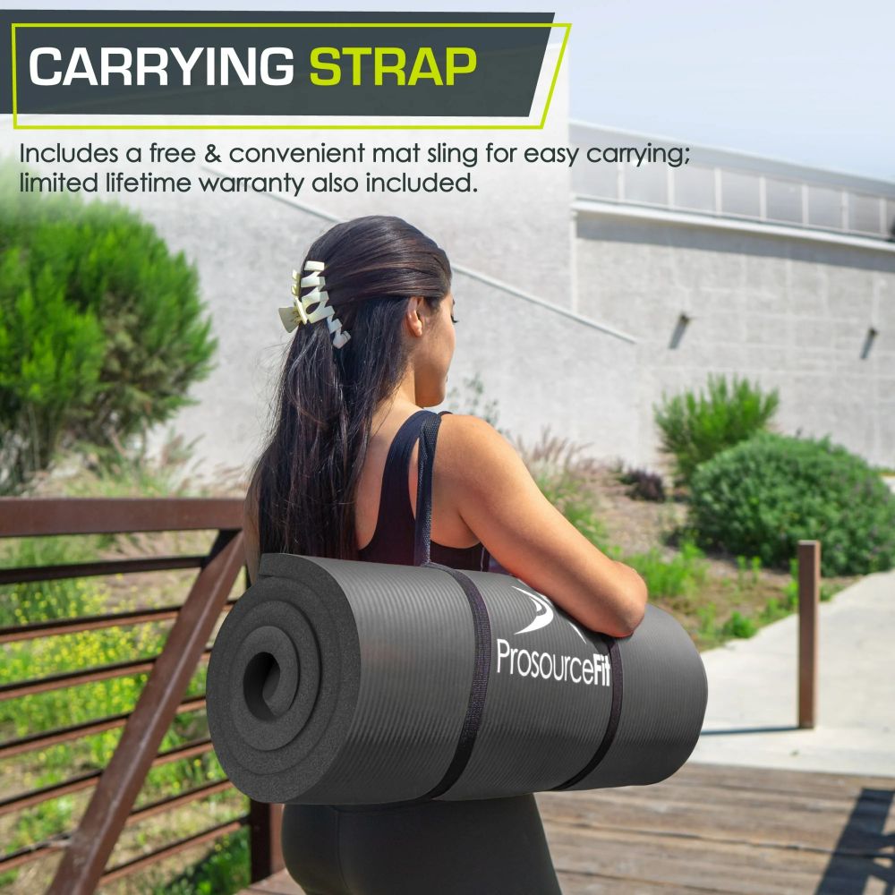 Enjoy your yoga or Pilates practice without having to bunch up towels to put under your knees or back. Get all of the comfort and cushion you need from the ProsourceFit Extra Thick Yoga and Pilates Mat. 1-inch (25mm) thick foam for the protection you need for floor exercises. The 1-inch creates a barrier between you and hard floors so you can do camel pose, boat pose, the Pilates 100, or cat cow without discomfort. Have super sensitive joints or recovering from a recent injury? The 1-inch provides superior comfort so working out doesn’t have to be painful. At almost 6-feet long, this mat suits most anyone, even tall users. Ribbed NBR foam provides a non-skid mat surface for fitness and exercise of various types and it is naturally moisture-resistant. It’s easy to clean and roll up after working out and it comes with a free mat sling to make it easy to carry to and from your yoga or Pilates workout session! Care Instructions: Wipe mat with wet cloth or sponge. Allow plenty of time to dry. Not machine washable For questions or concerns, please contact customer service: (855) 552-2637. We are open Monday – Friday from 8:30AM – 4:30PM Pacific Standard Time