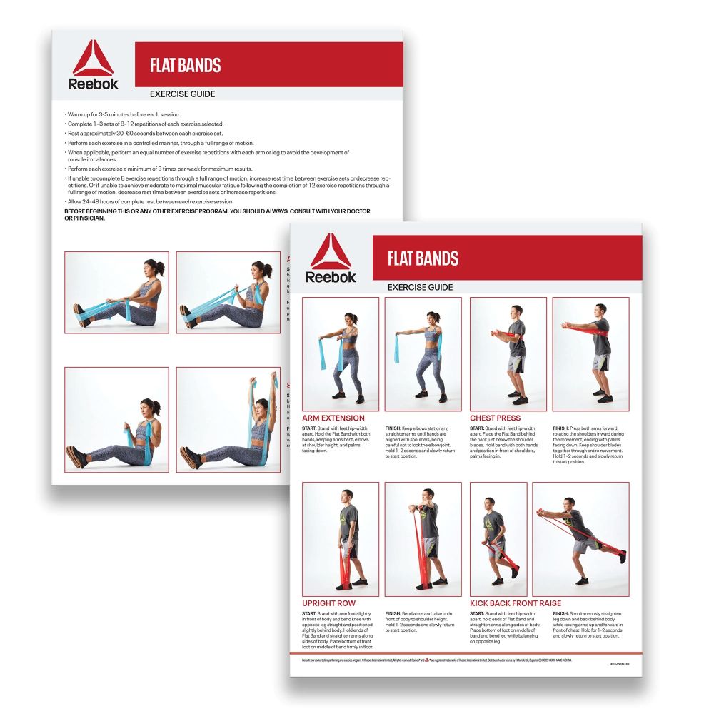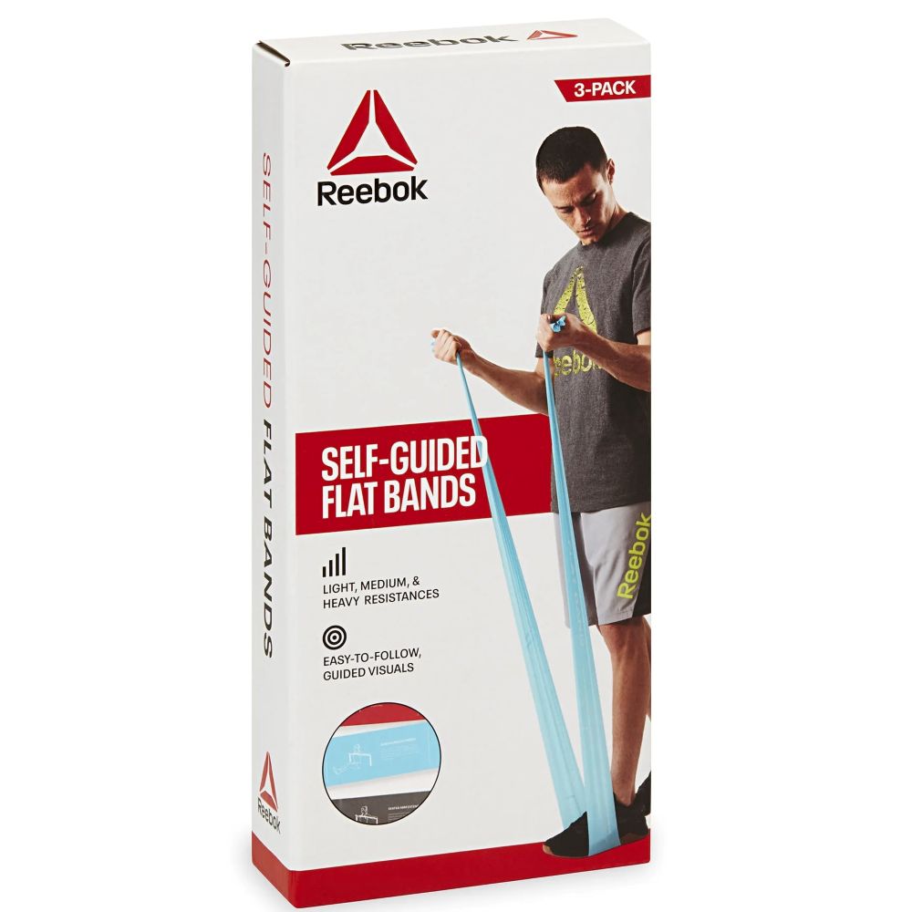 • Includes: Reebok Flat Resistance Bands 3-Pack, Set of Three Exercise Bands, and Workout Guide